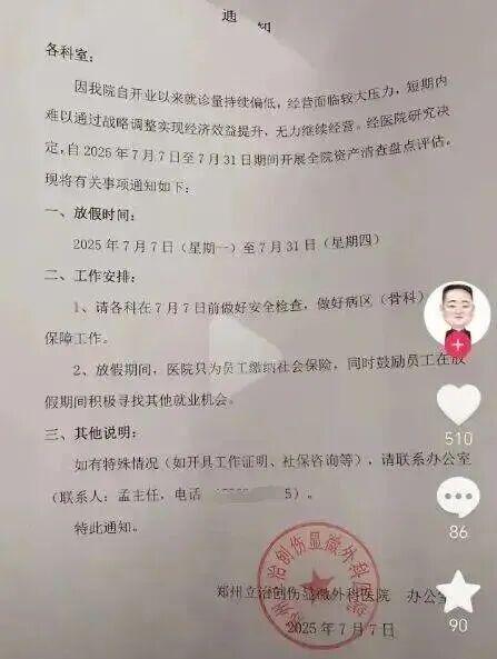 这份7月初发布的通知,字里行间全是无奈:开业8个月,就诊量持续偏低,经营压力大到撑不下去,只能先放假盘点资产,社保照交但工资停发,让员工自寻出路……